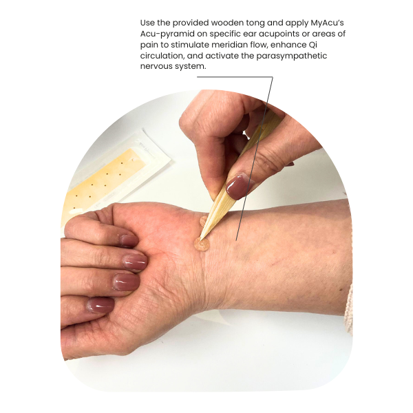 Use the provided wooden tong and apply MyAcu’s Acu-pyramid on specific ear acupoints or areas of pain to stimulate meridian flow, enhance Qi circulation, and activate the parasympathetic nervous system.