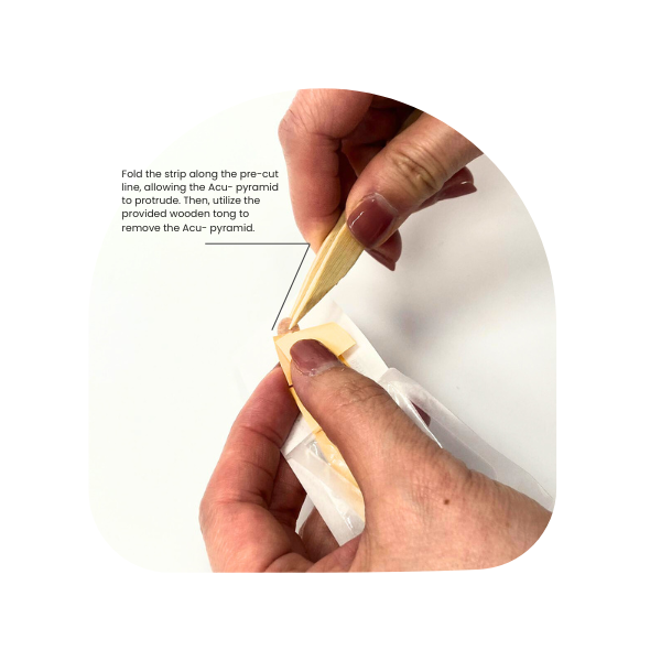 Fold the strip along the pre-cut line, allowing the Acu- pyramid to protrude. Then, utilize the provided wooden tong to remove the Acu- pyramid.