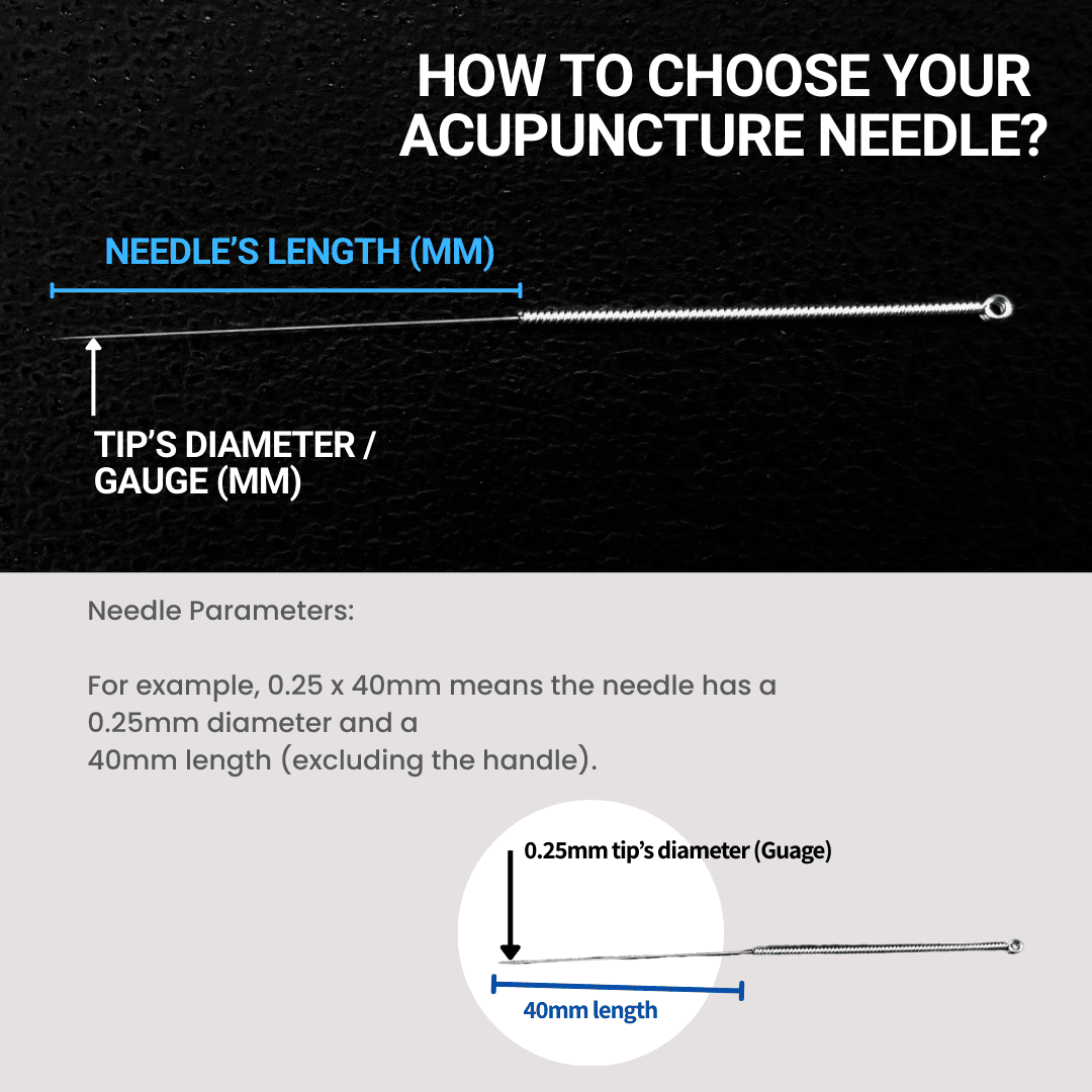 When selecting acupuncture needles, it’s important to understand the key parameters. For example, a needle marked as 0.25 x 40mm means the needle’s tip has a diameter of 0.25mm (gauge), and the overall length of the needle is 40mm (excluding the handle). Knowing these details ensures you choose the right needle size for your treatment needs.