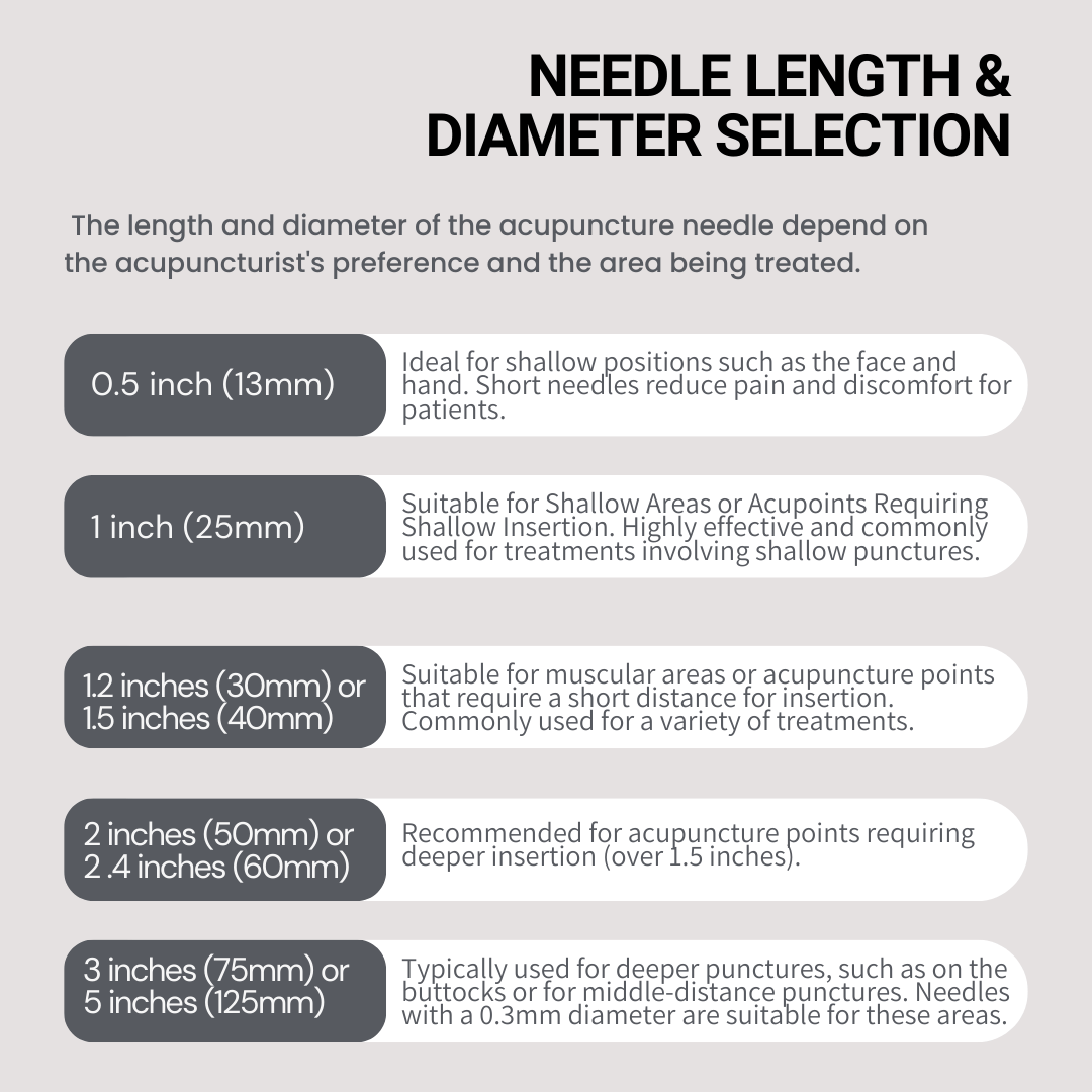 The length and diameter of acupuncture needles are chosen based on the acupuncturist’s preference and the area being treated. For shallow areas like the face and hands, 0.5 inch (13mm) needles are ideal, providing minimal discomfort. Needles of 1 inch (25mm) or 1.5 inch (40mm) are commonly used for muscular areas and points requiring a short insertion distance. For deeper treatments, 2 inch (50mm) needles are perfect for acupoints needing deeper penetration. Finally, for areas like the buttocks or for deeper punctures, 3 inch (75mm) or 5 inch (125mm) needles with a 0.3mm diameter offer the right depth and precision for effective therapy.